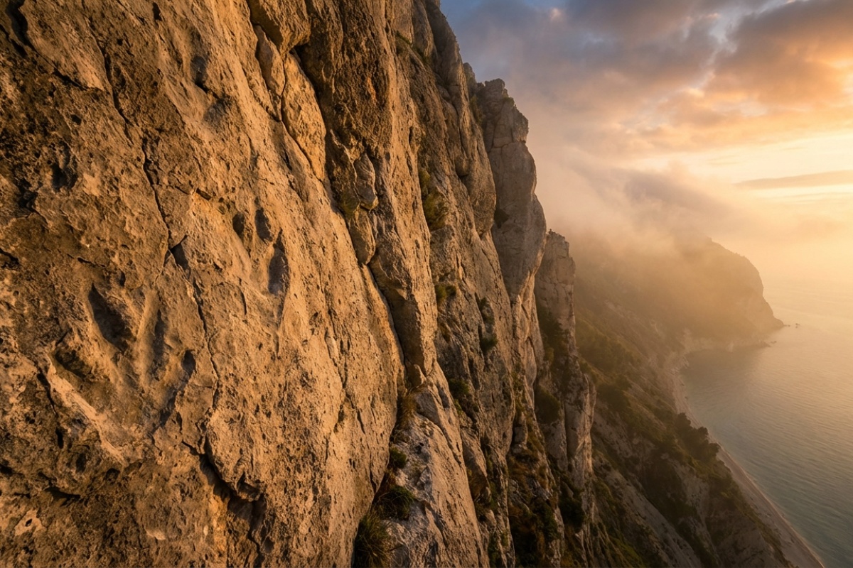 Under en klättring längs Monte Còneros branta väggar i närheten av staden Ancona, i den italienska regionen Marche, gjordes ett fynd som skickade eko genom den vetenskapliga världen. Vad som först verkade vara enkla skåror och fördjupningar i stenen visade sig vara ett fruset ögonblick från kritperioden – ett dramatiskt vittnesbörd om en värld som försvann för miljontals år sedan.