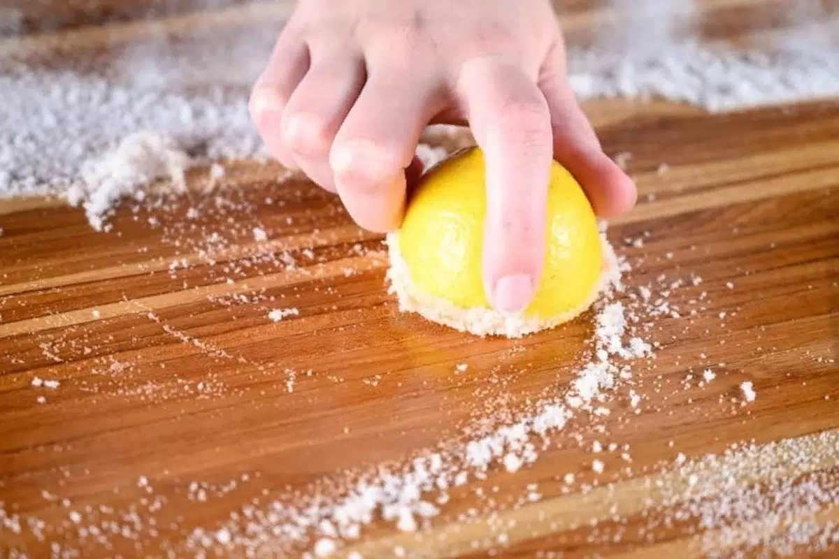 Salt och citron mot lukt och fläckar. Strö grovt salt på skärbrädan och gnugga med en halv citron. Denna kombination hjälper till att dra bort rester, neutralisera lukt och rengöra ytan. Det rekommenderas att göra detta en eller två gånger i månaden.