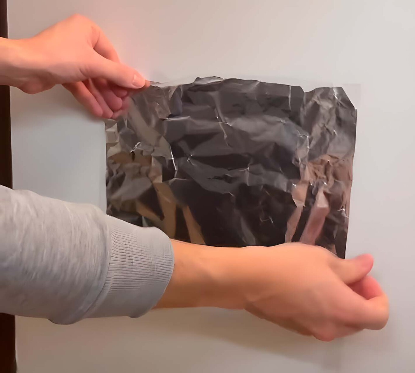 Som vi sa kommer detta knep mot fukt i väggarna från Sverige. Rekommenderar att man skär ut en bit aluminiumfolie, som den vi har hemma för att slå in mat, klistrar fast den på väggen eller taket där vi har fukt och låter den sitta i några timmar eller till och med en dag, beroende på hur fuktigt det är.