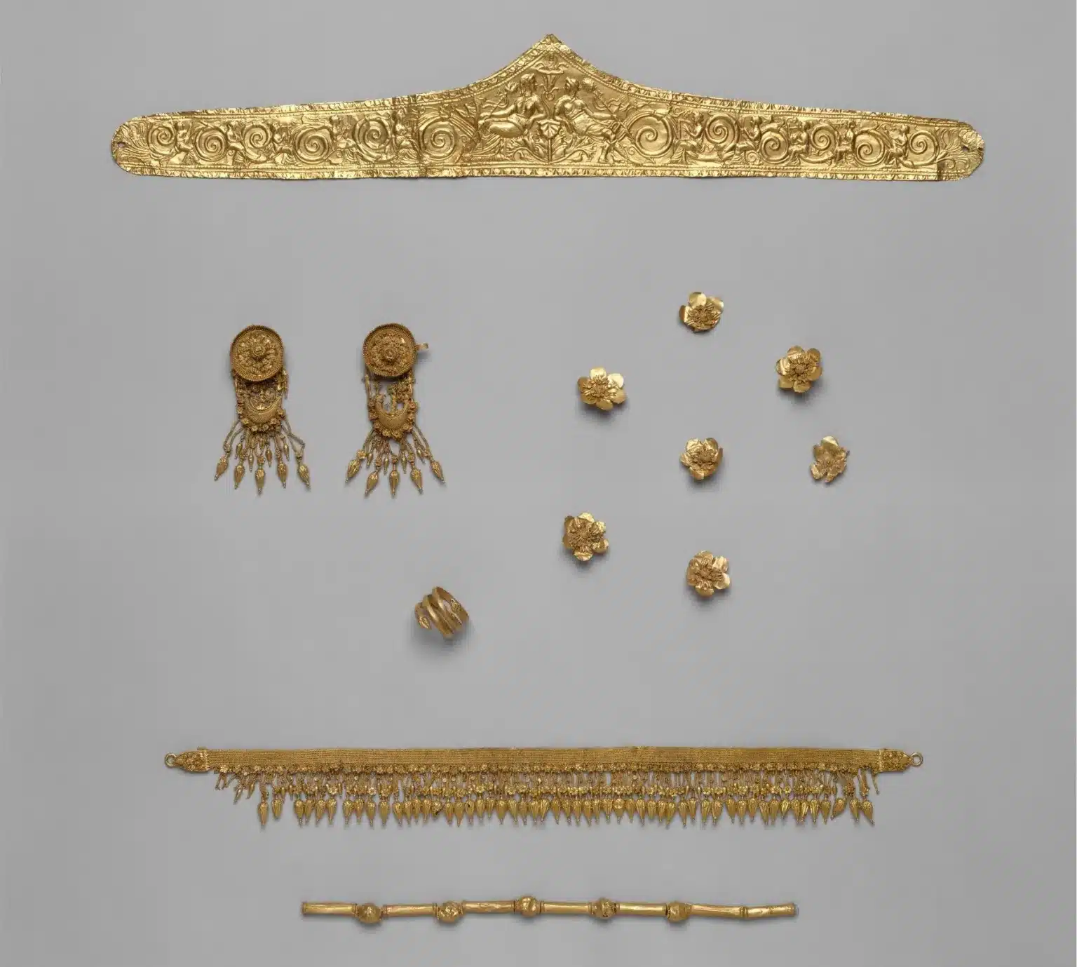 Både manliga och kvinnliga gravar innehåller gravgåvor med guldsmycken. Huvudbonader, diadem och vissa typer av örhängen förknippas dock främst med kvinnliga sammanhang. Deras närvaro i begravningssammanhang indikerar oftast en hög social ställning.