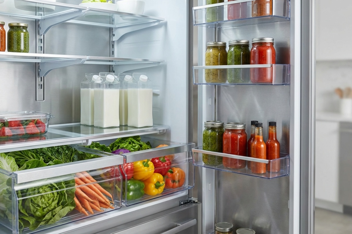 Den nedersta hyllan är den kallaste platsen i kylskåpet. Den är idealisk för kött, inte bara på grund av temperaturen utan även för säkerheten – om något läcker, förorenar det inte andra produkter. Förvara köttet i originalförpackningen eller i en tättslutande behållare.