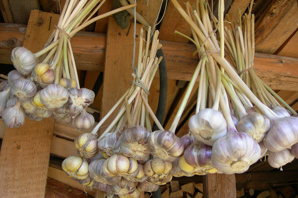 Istället för att fläta stjälkarna, hängs varje huvud upp genom pseudostjälken (så kallas den cylindriska strukturen som sticker ut från löken) så nära basen som möjligt. På så sätt blir resten av vitlöken näring för matskogen.