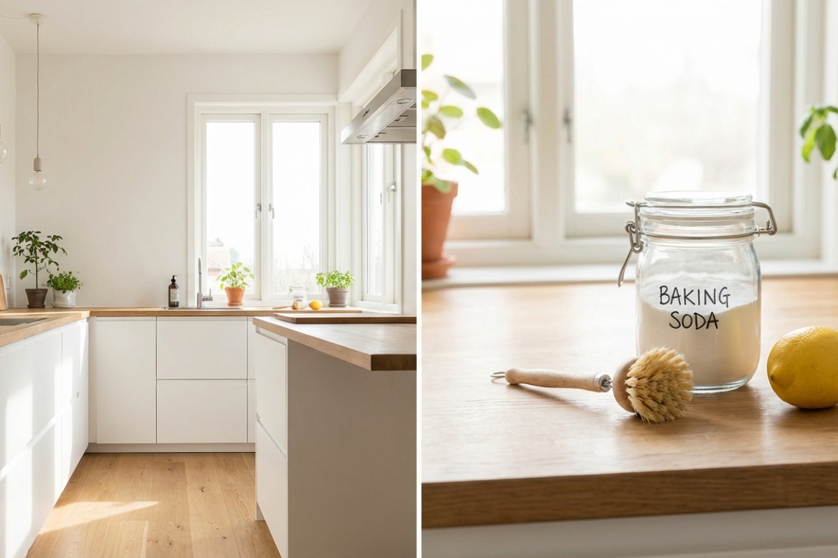 För att rengöra bänkskivor rekommenderar experter en blandning av tre delar bikarbonat och en del vatten. Applicera pastan direkt på fläckar eller spill, gnugga försiktigt med en mjuk svamp och torka sedan rent med en fuktig mikrofiberduk för att få bort alla rester.