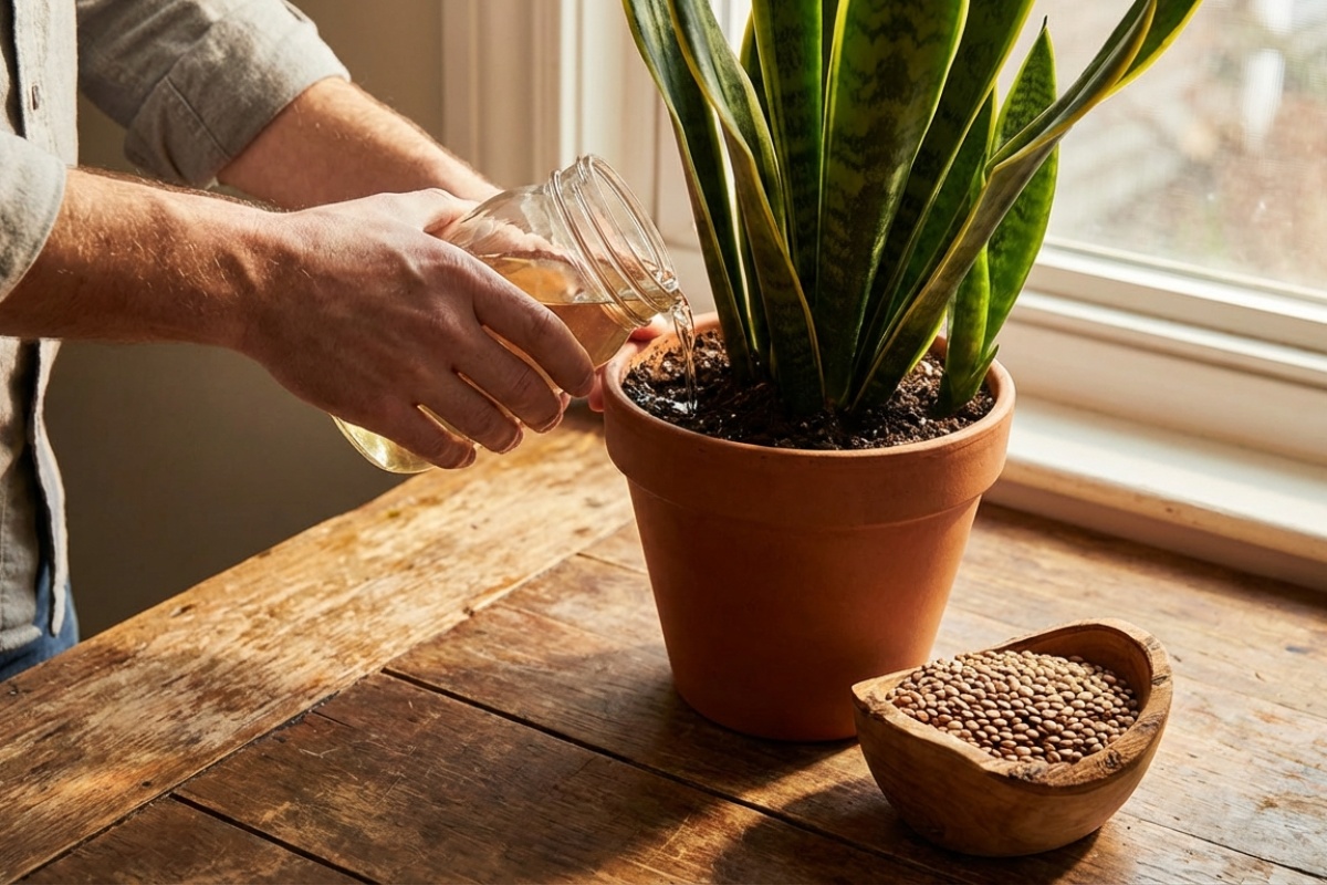 Att vattna din svärmorstunga (Sansevieria) med vatten från blötlagda linser är ett fantastiskt sätt att tillföra essentiella näringsämnen som fungerar som ett kraftfullt naturligt rotstimulerande medel. Denna teknik rekommenderas ofta av oss experter för att stärka växtens struktur och stimulera en hälsosam tillväxt på ett hållbart sätt.